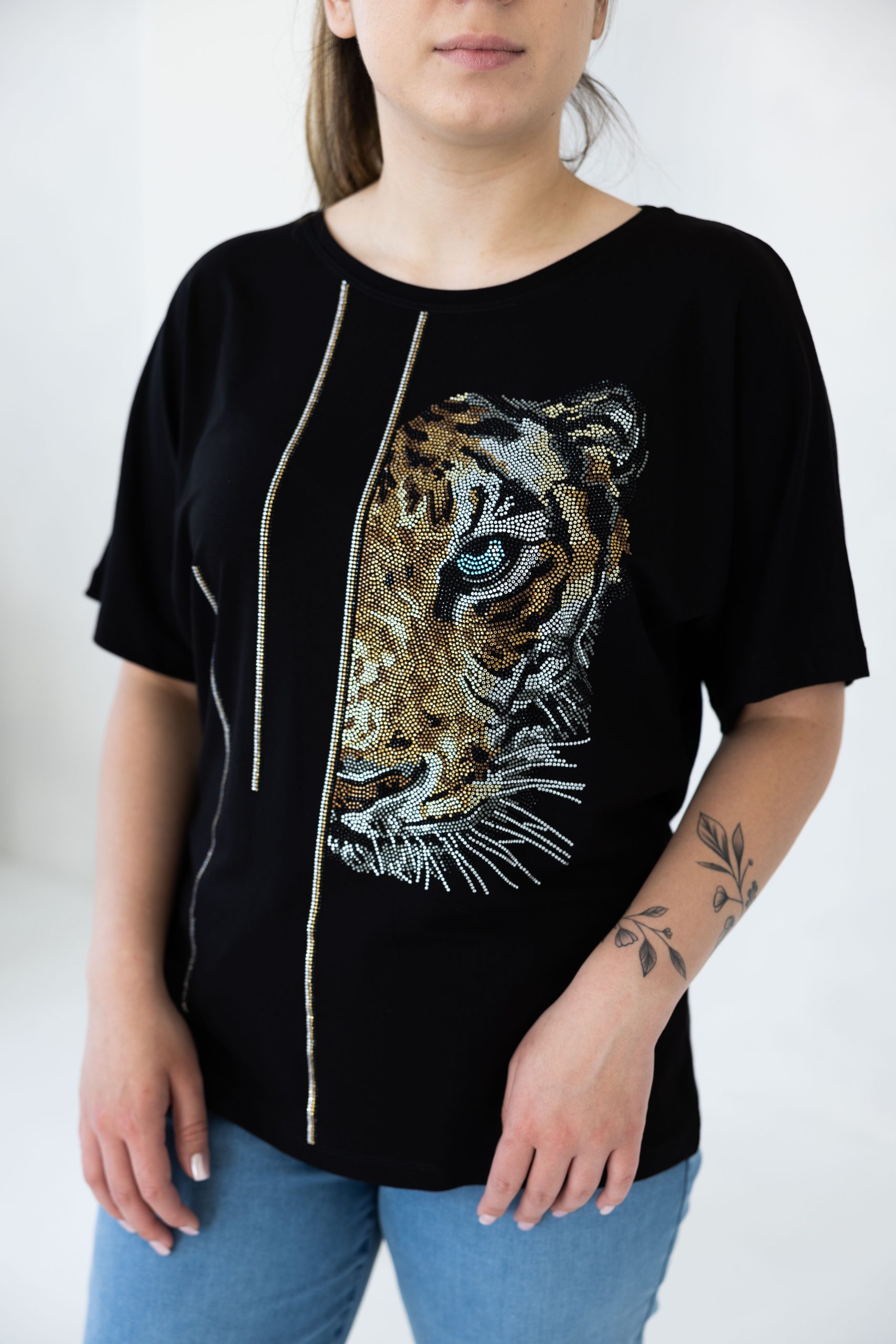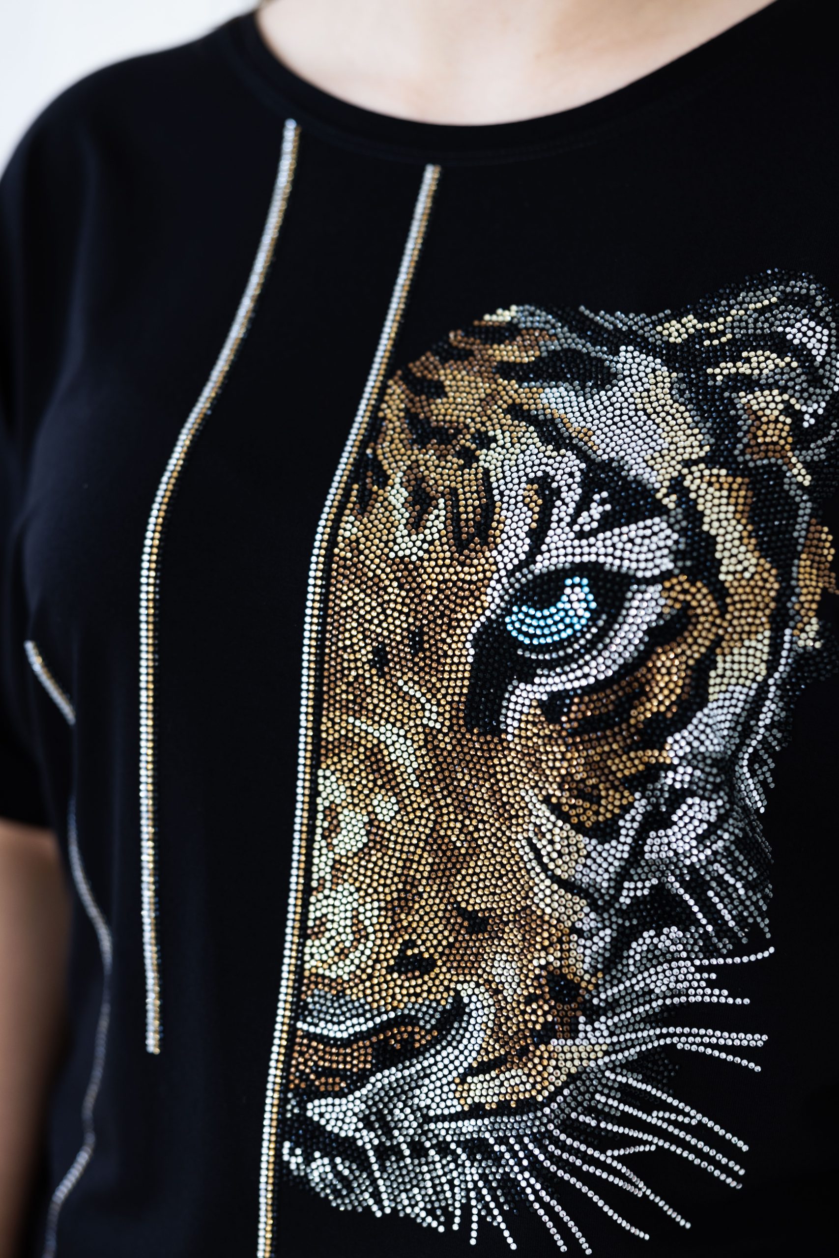 Make a bold statement with this Wild Essence Rhinestone Tiger Top featuring a striking tiger face graphic embellished with rhinestones for a fierce and fashionable look. This short-sleeve tee combines comfort with edge, perfect for anyone looking to showcase their untamed spirit. Dress it up with a jacket and trousers for a night out or keep it casual with jeans—this versatile tee is ready to roar with style wherever you go!
